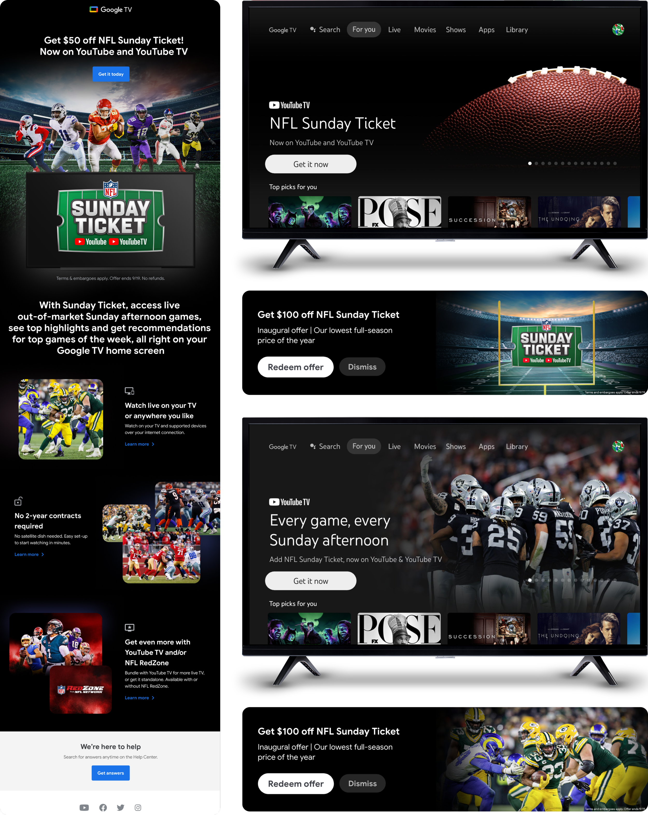 I was also given the opportunity to work with the Google TV team to create assets for their $50 - $100 off NFL Sunday Ticket offer. Within this collaboration, I designed email layouts showcasing the benefits and breakdown of NFL Sunday Ticket, banner ads and TV placements on their “For you” page.